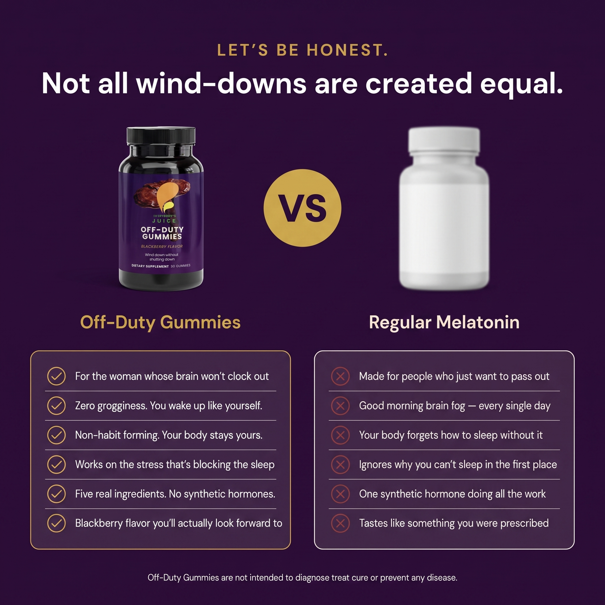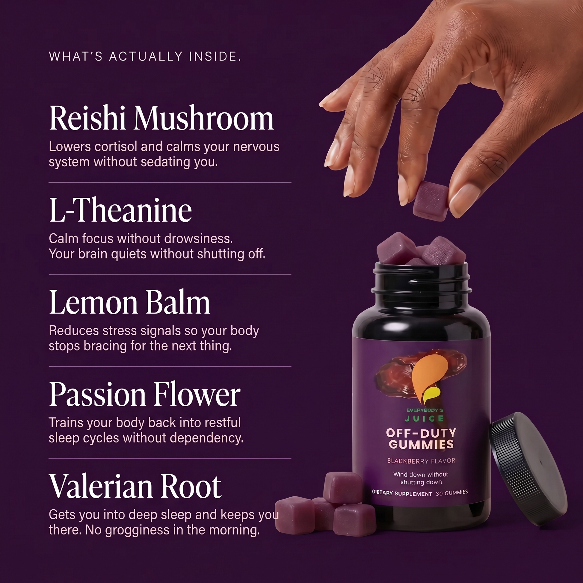 When stress stays elevated at night your body physically cannot enter deep sleep. Melatonin won't fix this. It forces your eyes shut while your nervous system stays activated. Off-Duty works differently. Reishi and Lemon Balm lower cortisol directly. L-Theanine quiets the mental noise. Passion Flower and Valerian Root signal your body that the threat is over. Sleep comes naturally, because the stress is actually gone.